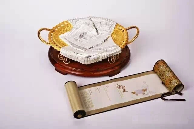 《和美》純銀絲巾果盤造型來源于中國(guó)傳統(tǒng)的竹編果籃,其上披一條柔軟的江南絲巾,四足則為由銀絲編制的具有中國(guó)特色的中國(guó)結(jié)造型。千錘百煉制造出這栩栩如生的效果,東方匠人用自己出神入化的手工技藝,令21世紀(jì)的偉大發(fā)明3D打印技術(shù)相形見絀。這果盤是由整塊足銀材料經(jīng)過上千萬次的純手工鏨刻而成。此件作品由中國(guó)工藝美術(shù)大師純手工制作,造型逼真、鏨刻細(xì)膩。精美絕倫之處更在于它以貴金屬材質(zhì)展現(xiàn)出了絲綢的質(zhì)感,尤其是絲巾細(xì)節(jié)之處的縷縷絲線和竹籃的藤條肌理效果的處理,既凸顯了絲巾的柔軟與細(xì)膩,又展現(xiàn)了竹籃的古樸與自然的視覺感受,是中國(guó)傳統(tǒng)鏨刻工藝作品中的一件藝術(shù)精品。